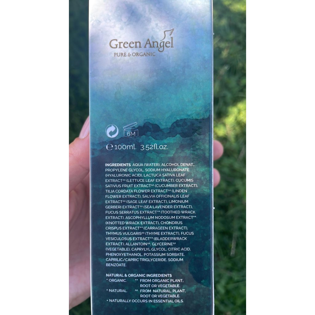 Ingredients list: Aqua, Alcohol Denat., Propylene Glycol, Sodium Hyaluronate (Hyaluronic Acid), Lactuca Scariola Sativa Leaf Extract( lettuce Leaf Extract) ^^, Cucumis Sativus Fruit Extract(Cucumber) ^^, Salvia Officinalis Leaf Extract (Sage leaf Extract) ^^, Tilia Cordata Flower Extract (Linden Flower Extract) ^^, Fucus Vesiculosus Extract (Bladderwrack Extract)**, Ascophyllum Nodosum Extract (Knotted Wrack Extract)**, Fucus Serratus Extract (Serrated Wrack Extract)**, Chondrus Crispus Extract (Carrageen Extract)**, Thymus Vulgaris Leaf Extract (Thyme Extract) ^^, Limonium Gerberi Extract (Sea Lavender Extract) ^^, Allantoin , Caprylyl Glycol, Glycerin , Citric Acid , Caprylic/Capric Triglyceride^^, Phenoxyethanol, Potassium Sorbate , Sodium Benzoate